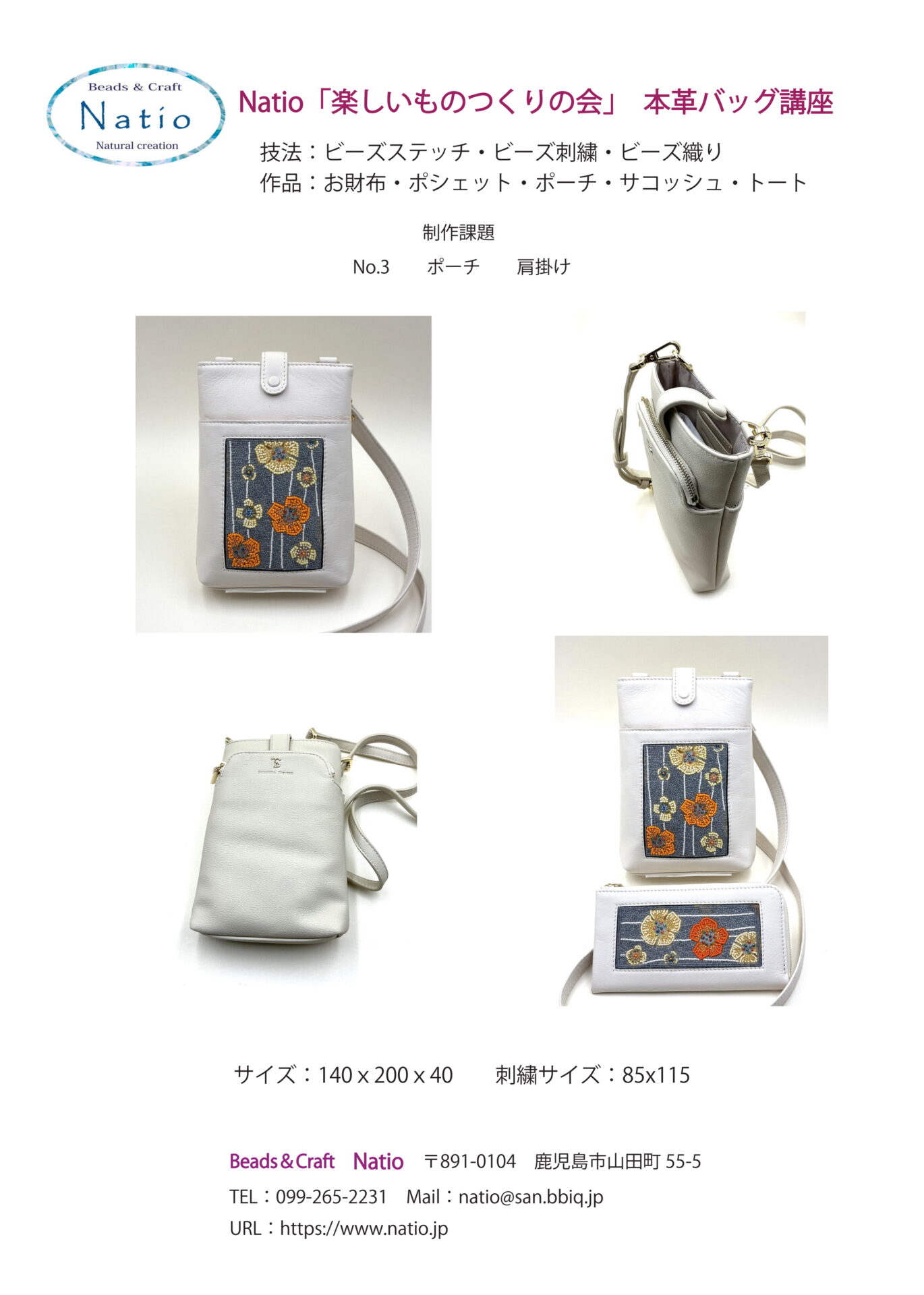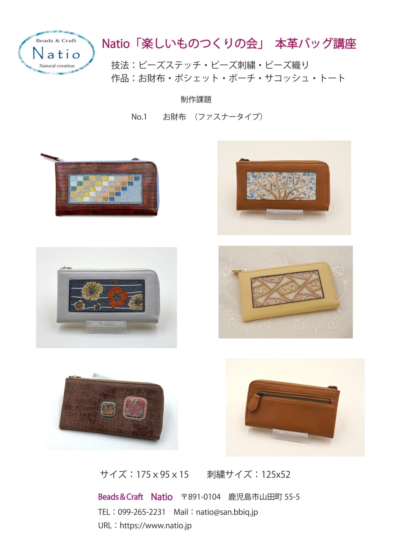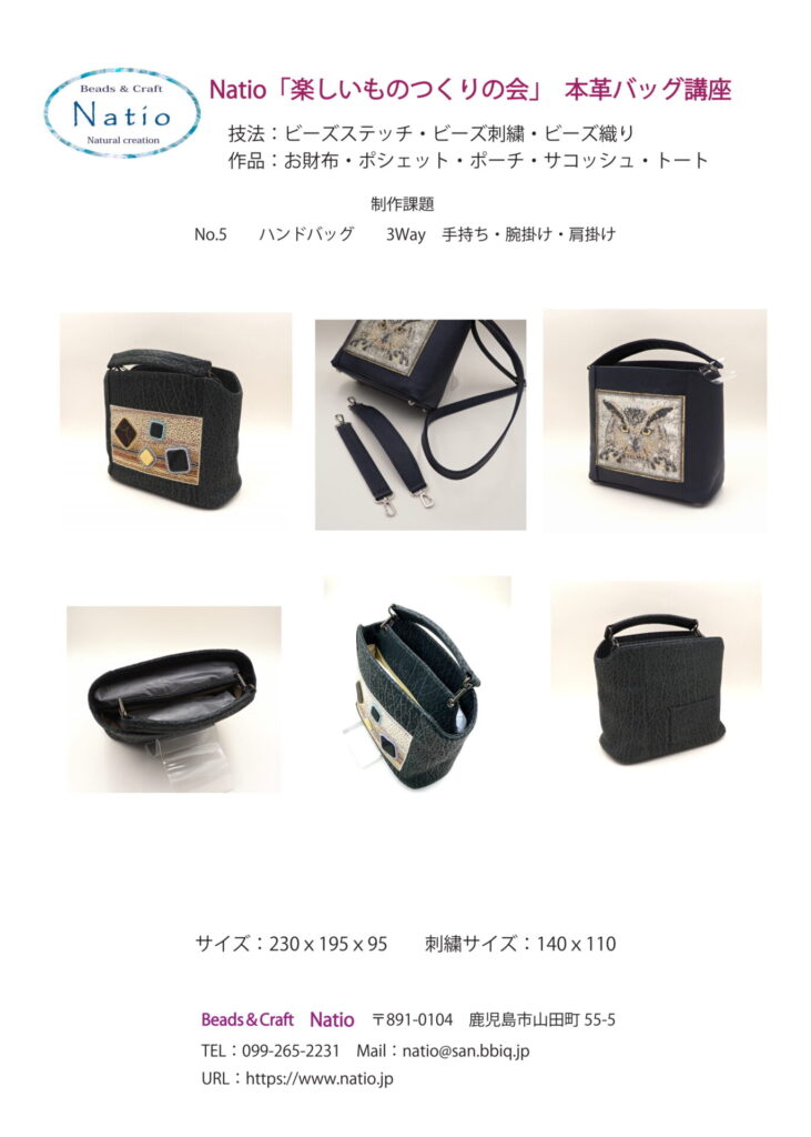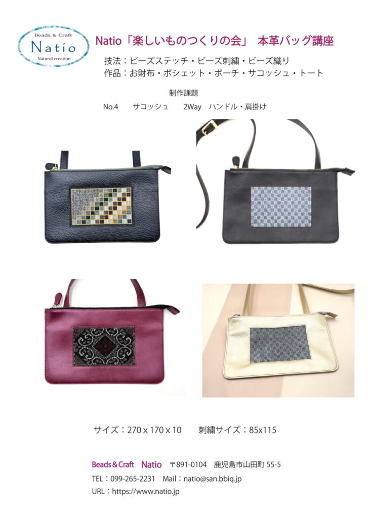 お財布・ポーチ・サコッシュ・トートバッグなどご自分で使用する物から始めます。本革の仕様で、Natioで型を起こしたオリジナルデザインを主体に創ります。ビーズ刺繍・ビーズ織り・ビーズステッチなどの技法で、自由課題では布カボション・布プレートなどパーツを付け、額縁サイズの変形や個数を増やしたり、多彩なコラボレーションでワクワクする「楽しいもの創り」で実用的な作品を創ります。東京・大阪・名古屋・鹿児島以外は通信になります。