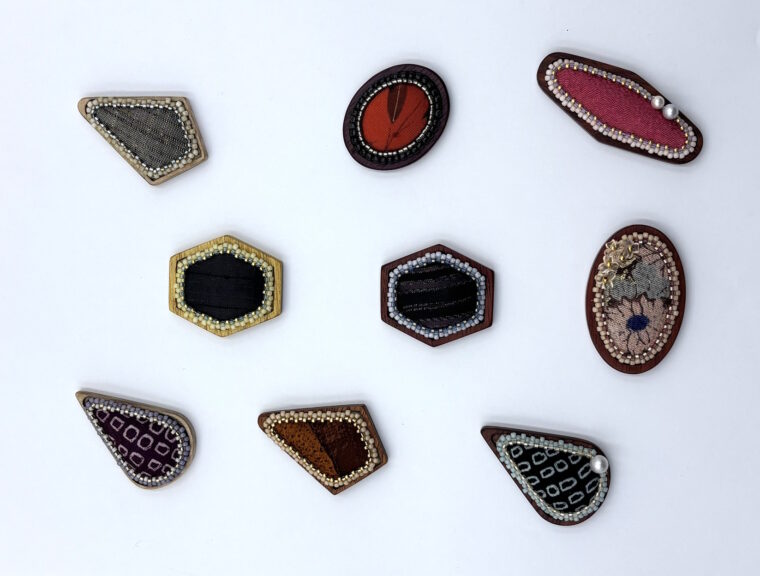 Natioの布カボションアソートセットを使用して、ペヨーテステッチでフレーミングしたり、ソータシエコードで囲んだり、包み込む技法の講習会です。レシピがないので、講師と共に皆さんの感性を織りこみ、唯一無二のオリジナルを創る、今までにないタイプの講習会にしています。