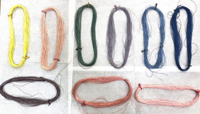 原色:すくも藍・紅花(桃)(赤)(橙)(黄)・和墨・さくら(樹皮)・紫根・柿渋・蘇芳
